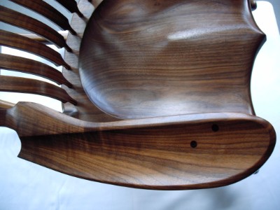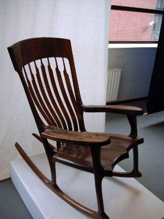 "Geïnspireerd door de schommelstoel van de Amerikaanse meubelmaker Sam Maloof (1916-2009) heeft Hans Defauwes onze schommelstoel geheel handmatig vervaardigd.